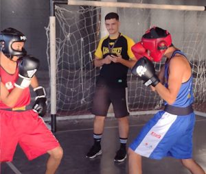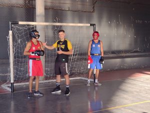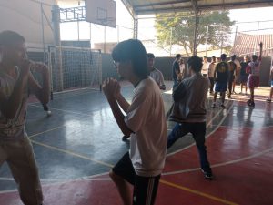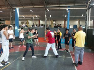 No segundo momento da vivência esportiva, divididos em grupos, os alunos aprenderam os fundamentos técnicos básicos do boxe, como posição de combate, golpes retos e deslocamentos de perna.