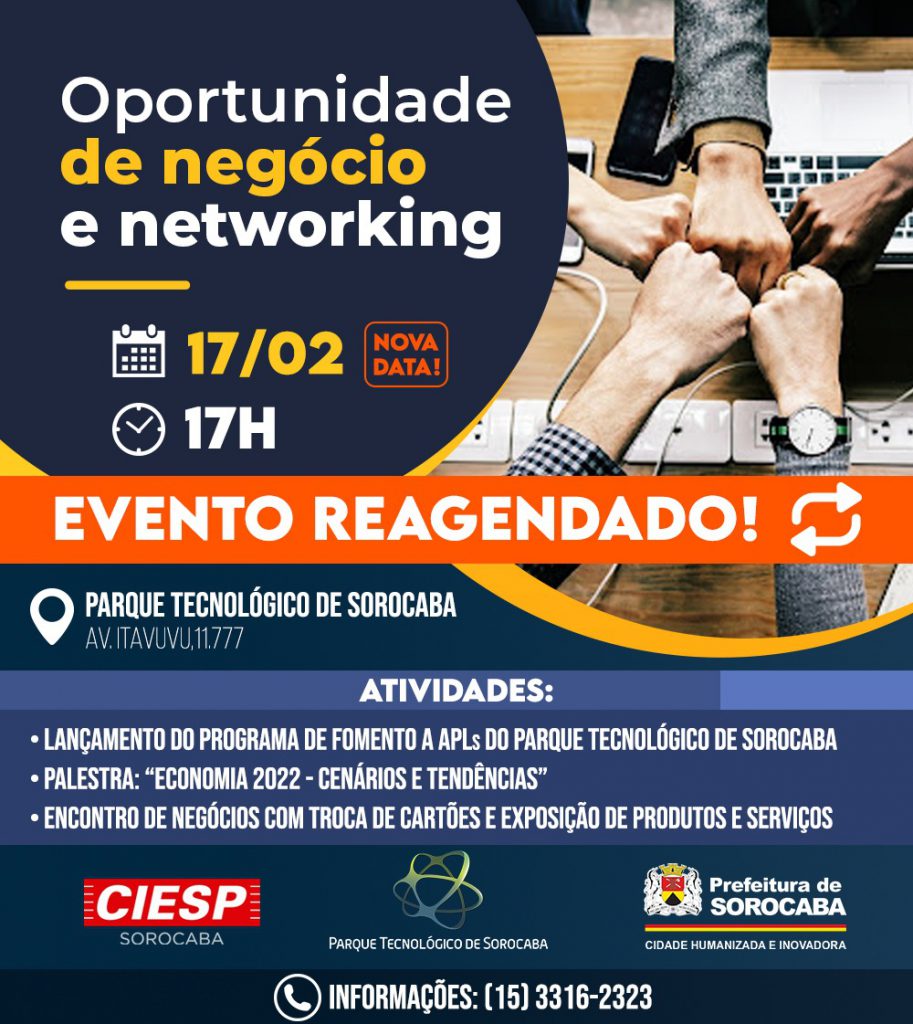 O Parque Tecnológico de Sorocaba (PTS) reagendou para o dia 17 de fevereiro, às 17 horas, o Encontro de Negócios e Lançamento do Programa de Fomento aos Arranjos Produtivos Locais (APLs), evento que vai reunir empresários e empreendedores da Região Metropolitana de Sorocaba (RMS). A medida acontece em razão do aumento do número de casos de síndrome gripal em todo o estado de São Paulo.