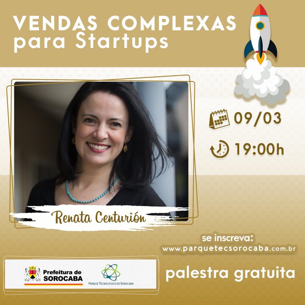 O PTS (Parque Tecnológico de Sorocaba) convidou a diretora da Winning by Design, Renata Centurión, para falar sobre vendas complexas para startups. A inscrição para o evento, que será realizado às 19h da próxima segunda-feira (9), é de graça e deve ser feita em: https://parquetecsorocaba.com.br/.