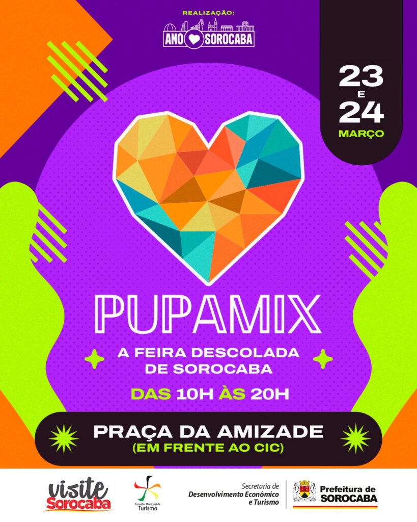 A Praça da Amizade, localizada em frente ao Estádio Municipal “Walter Ribeiro”, o CIC, será palco da “Pupamix, a feira descolada de Sorocaba”, nos dias 23 e 24 de março, das 10h às 20h. O evento, gratuito e aberto ao público, reunirá expositores de diversos segmentos, como moda, gastronomia, artesanato, decoração e muito mais.