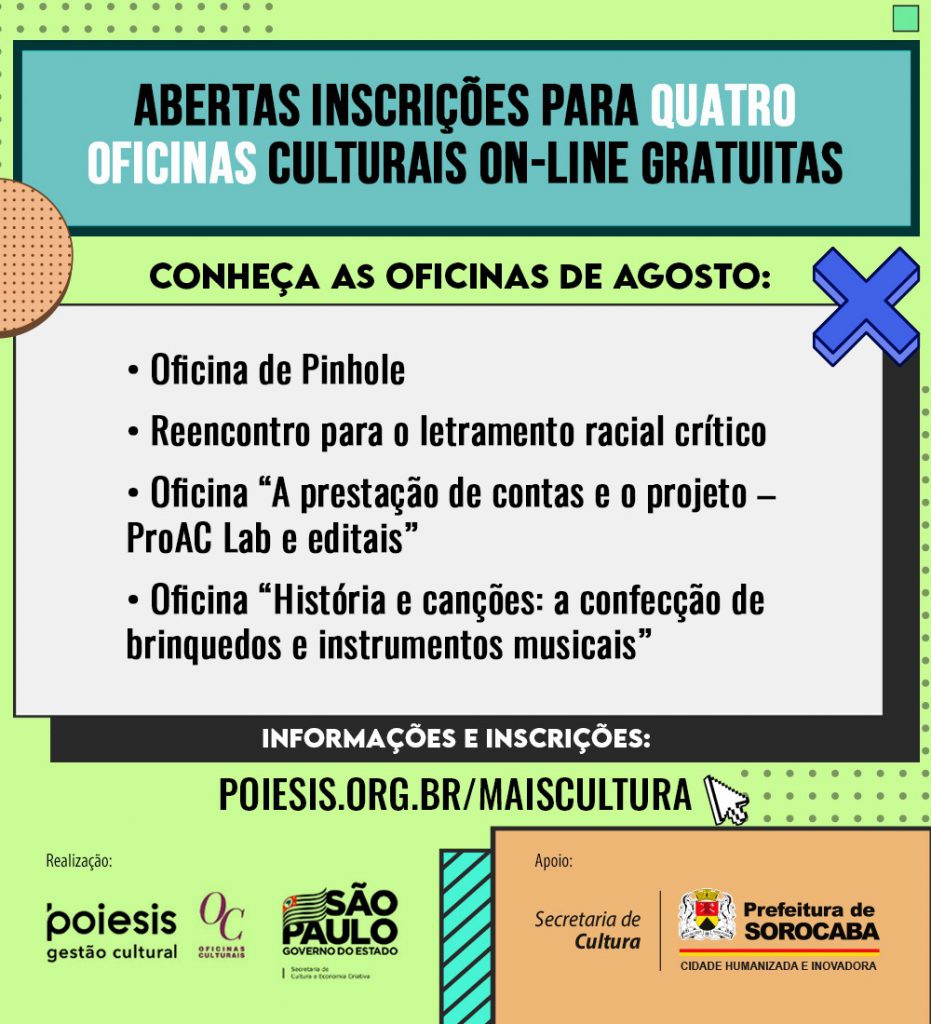 A população já pode se inscrever em quatro oficinas culturais on-line gratuitas, que serão oferecidas em agosto pela Secretaria de Cultura e Economia Criativa do Estado de São Paulo, em parceria com a Prefeitura de Sorocaba, por meio da Secretaria da Cultura (Secult). As aulas acontecerão, ao vivo, pela plataforma Zoom.