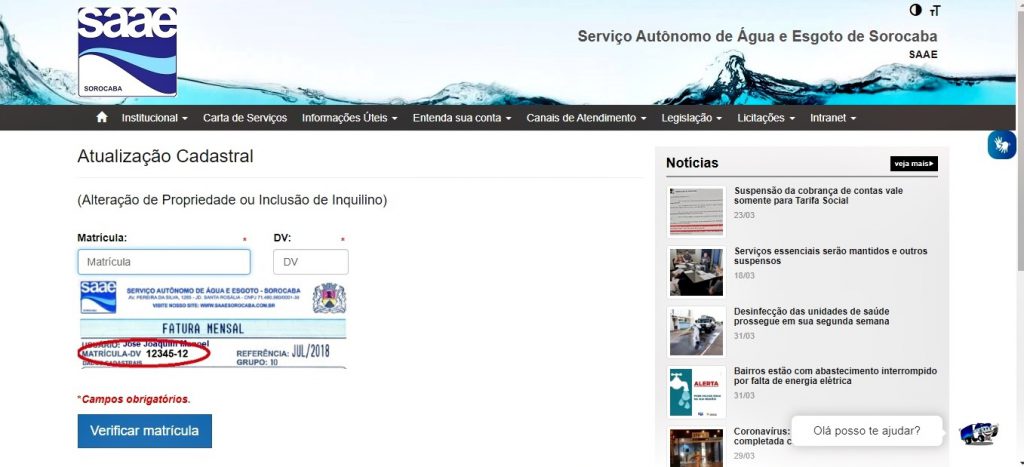 Para realizar essas atualizações cadastrais de forma on-line o interessado deverá ter em mãos uma conta de água e esgoto, pois o primeiro passo é a inserção do número da matrícula que consta no boleto de pagamento, que identifica o imóvel junto à autarquia.