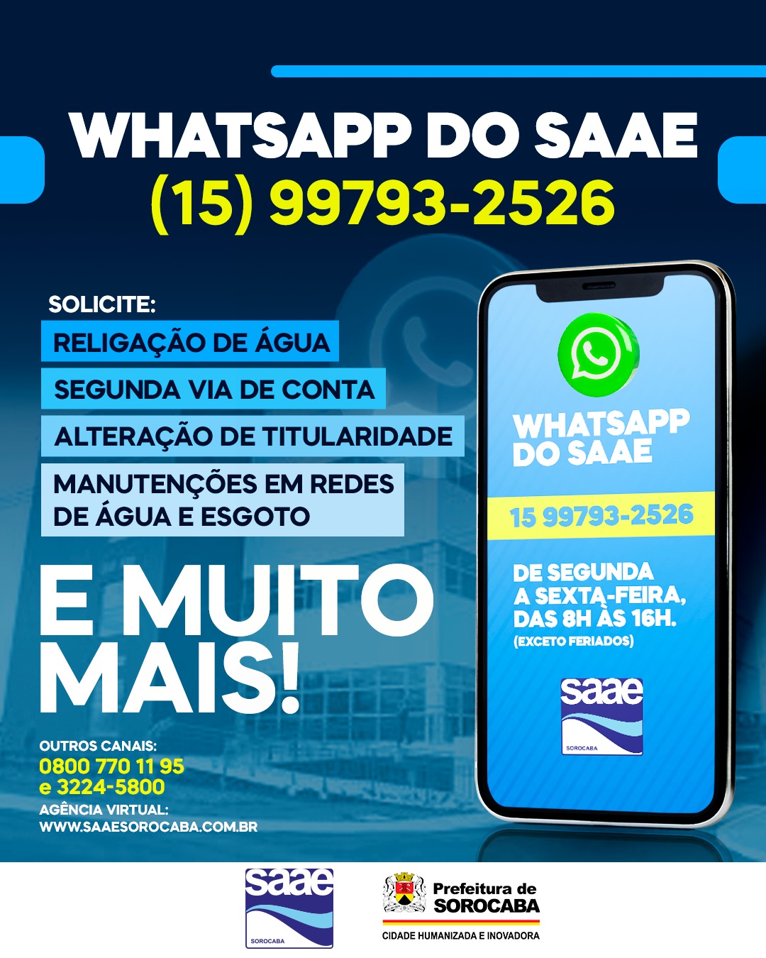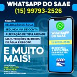 O Serviço Autônomo de Água e Esgoto (Saae) de Sorocaba, desde esta segunda-feira (11), opera com um novo número de WhatsApp: (15) 99793-2526, para atendimento de demandas da população. O contato passa a ser definitivo, sendo que, até então, a autarquia utilizava um número temporário.