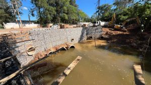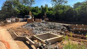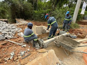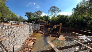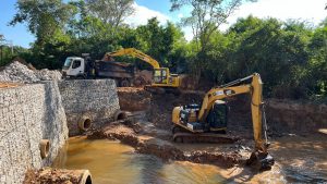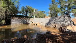 No início deste mês, iniciou-se a mobilização para instalação do muro de arrimo, com tela tipo gaiola, arame galvanizado e pedra marroada, também conhecido como “gabião”. A estrutura serve para conter e prevenir deslizamentos do talude do córrego. O muro tem extensão total de cerca de 60 metros, aproximadamente, por cinco metros de altura.