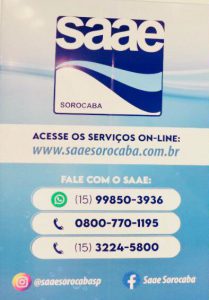 O Saae/Sorocaba, além dos serviços on-line oferecidos pela sua Agência Virtual, disponibiliza ainda canais de comunicação diretos de atendimento ao munícipe, pelo WhatsApp (15) 99850-3936 (para informar sobre religação e falta de água, eventuais vazamentos de água e esgoto, limpeza de bocas de lobo e troca de registro, entre outros serviços), bem como os telefones 0800-7701195 (ligação gratuita), (15) 3224-5800 e o e-mail: fale@saaesorocaba.sp.gov.br.