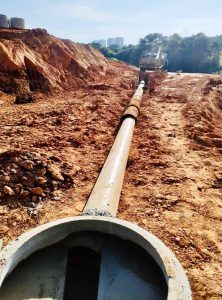 Para o trecho citado, os trabalhos foram organizados em duas etapas. A primeira delas ocorreu de 7 a 17 de junho e consistiu na implantação da travessia de 120 metros de rede de esgoto, dos quais foram implantados 90 metros de tubo de PVC de 300 milímetros e 30 metros de tubo de 150 mm, revestido de 86 metros de tubo de aço de 400 mm de diâmetro, para suportar cargas externas (aterro e sistema viário), além das conexões.