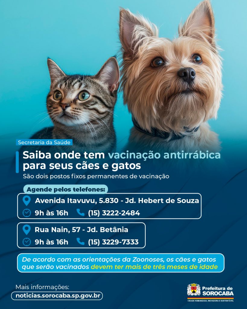 Desde maio de 2024, a Prefeitura de Sorocaba conta com dois postos de vacinação antirrábica. De acordo com a Zoonoses, os cães e gatos que serão vacinados mediante agendamento devem ter mais de três meses de idade.