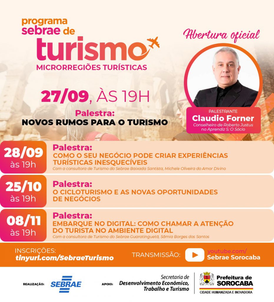 A Prefeitura de Sorocaba, por meio da Secretaria de Desenvolvimento Econômico, Trabalho e Tursimo (Sedettur), informa que, no Dia Mundial do Turismo (27 de setembro), o Sebrae lançará o Programa “Sebrae Microrregiões Turísticas”.
