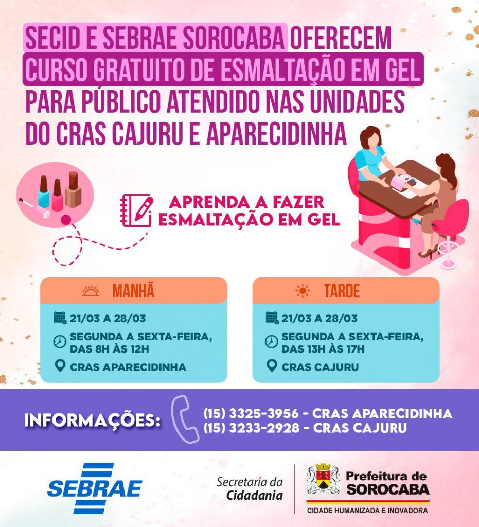A Prefeitura de Sorocaba, por meio da Secretaria da Cidadania (Secid) e em parceria com o Sebrae Sorocaba, preparou curso gratuito de qualificação profissional para esmaltação em gel, que está sendo oferecido em duas unidades do Centro de Referência em Assistência Social (CRAS). As aulas acontecerão de 21 a 28/3, de segunda a sexta-feira, em dois horários diferentes, sendo das 8h às 12h, na unidade do CRAS Aparecidinha e das 13h às 17h, no CRAS do Cajurú.
