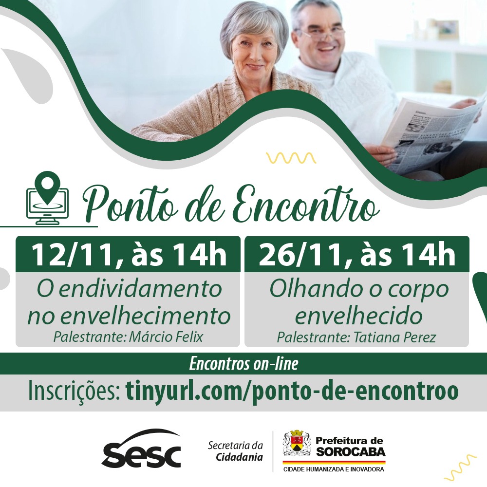 Neste mês de novembro, haverá dois desses eventos: dia 12/11, às 14h, sobre “O Endividamento no Envelhecimento”, com a participação do palestrante Márcio Felix, que é coach, com formação pelo Instituto Brasileiro de Coach (IBC), além da formação em Administração de Empresas e especialização em Gestão Estratégica de Negócios. Já, no dia 26/11, às 14h, o encontro será sobre o tema “Olhando o Corpo Envelhecido”, com a palestrante Tatiana Perez, que é educadora de atividades físico-esportivas do Sesc Sorocaba.