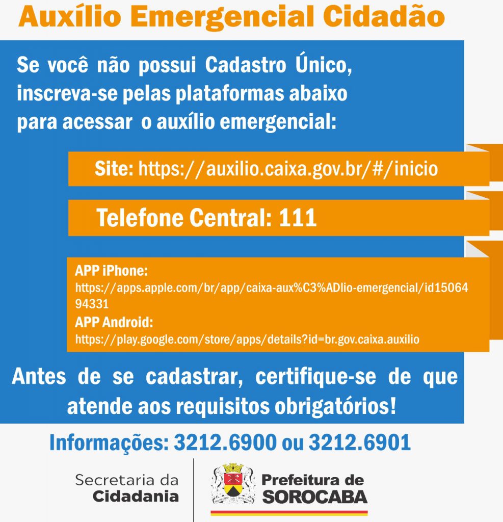 Para auxiliar quem necessita do Auxílio Emergencial do governo federal, sancionado na última quinta-feira (02), a Prefeitura de Sorocaba por meio da Secretaria de Cidadania (Secid) está reforçando a informação sobre o lançamento, ocorrido nesta terça-feira (7), da plataforma para inscrição para aqueles cidadãos que serão contemplados pela ação, porém não possuem o Cadastro Único (CadUni), por meio da Caixa Econômica Federal.