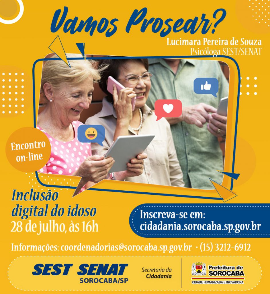 Com a temática “Inclusão digital do idoso”, o bate-papo será conduzido pela psicóloga do SEST SENAT, Lucimara Pereira de Souza, no próximo dia 28 de julho, às 16h.