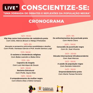 Palestras, bate-papos e apresentações de danças fazem parte da programação do evento “Conscientize-se: Uma jornada de debates e reflexões da população negra”. As atividades apoiadas pela Prefeitura de Sorocaba, por meio da Secretaria da Cultura (Secult) e da Secretaria da Cidadania (Secid), são promovidas pela Coordenadoria da Igualdade Racial e Conselho de Participação e Desenvolvimento da Comunidade Negra (CPDCNS) durante os dias 16 a 24 de novembro. O evento acontece em comemoração ao Dia da Consciência Negra (20 de novembro) e será transmitido pelo Facebook através do link: https://www.facebook.com/cpdcns.