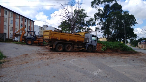 Retroescavadeira e caminhão com entulho oriundo da limpeza de área pública