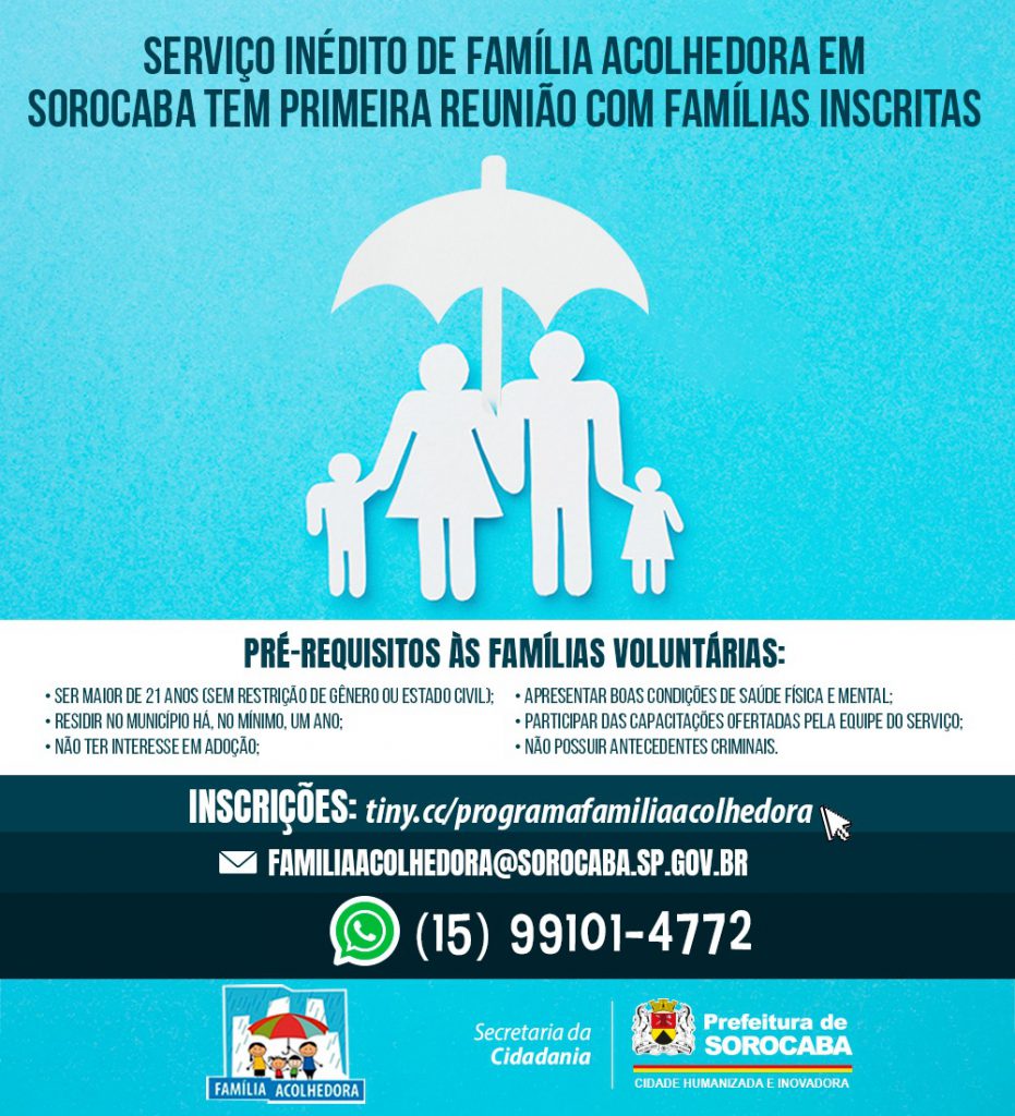 Para obter mais informações a respeito do serviço e de como se inscrever, os contatos são pelo site: tiny.cc/programafamiliaacolhedora; pelo Whatsapp: (15) 99101-4772 ou pelo e-mail: familiaacolhedora@sorocaba.sp.gov.br.