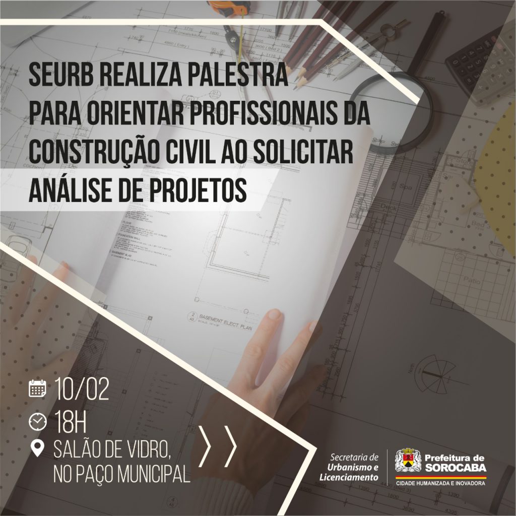 A Prefeitura de Sorocaba, por meio da Secretaria de Licenciamento e Urbanismo (Seurb) realiza, nesta quinta-feira (10), às 18h, no Salão de Vidro do Paço Municipal, uma palestra para orientar profissionais da construção civil sobre os procedimentos para solicitar a análise e aprovação de projetos de obras pela Administração Municipal, evitando eventuais atrasos nesses processos.