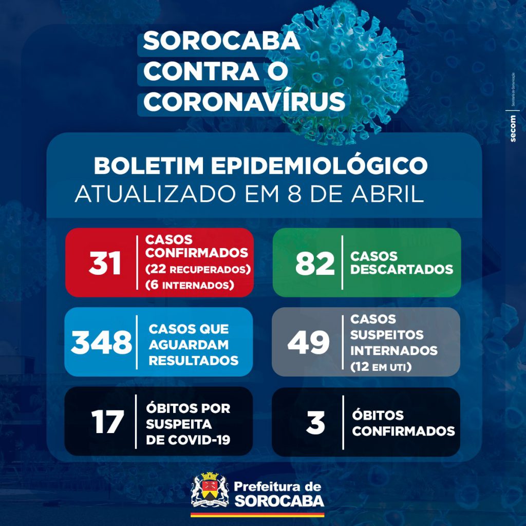 Nesta quarta-feira (08) a Prefeitura de Sorocaba, por meio da Secretaria da Saúde (SES), registrou mais cinco novos casos confirmados da COVID-19. Com isso já são 31 casos confirmados na cidade. Deste total, seis estão internados (quatro em UTI) e 22 se recuperaram. Além disso, três óbitos foram registrados por conta da doença.