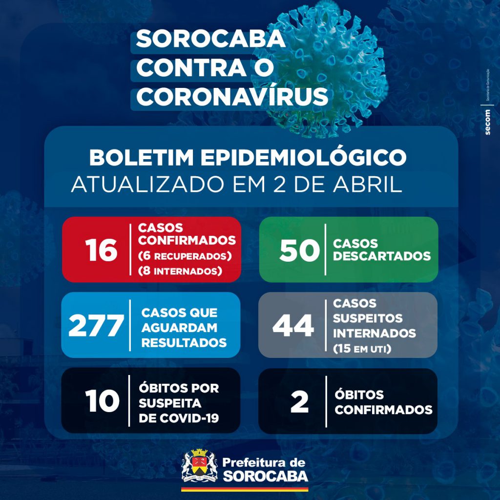 A Prefeitura de Sorocaba, por meio da Secretaria da Saúde (SES), registrou nesta quinta-feira (2) 16 casos confirmados do novo coronavírus. Deste total, oito estão internados, seis já se encontram recuperados e houve duas mortes confirmadas pela doença.