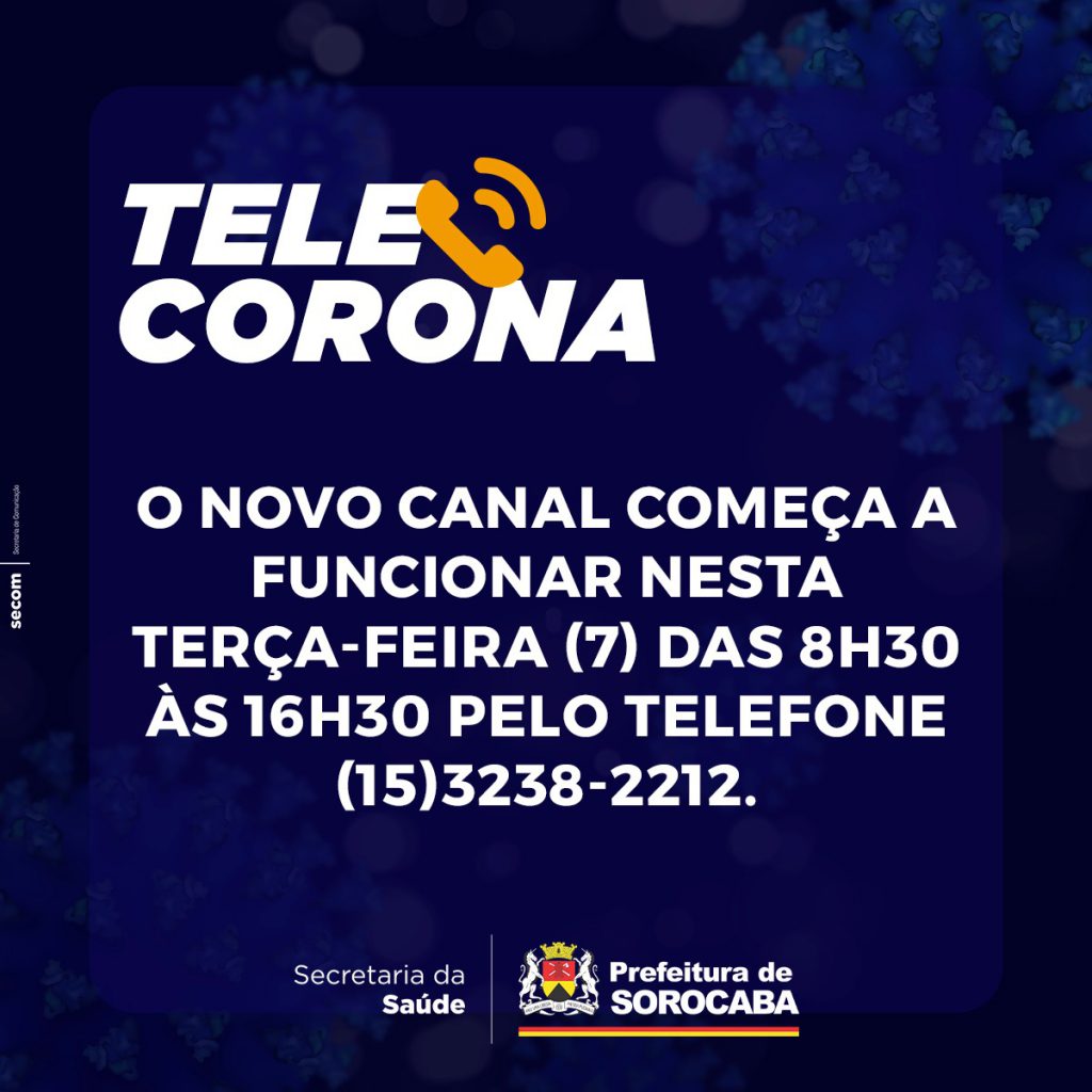 Com o objetivo de tirar dúvidas da população sobre o novo coronavírus e evitar que pessoas busquem atendimento nas unidades de saúde sem necessidade, a Prefeitura de Sorocaba criou o “Tele Corona”. O novo canal começa a funcionar nesta terça-feira (7), das 8h30 às 16h30, pelo telefone 15-3238-2212.