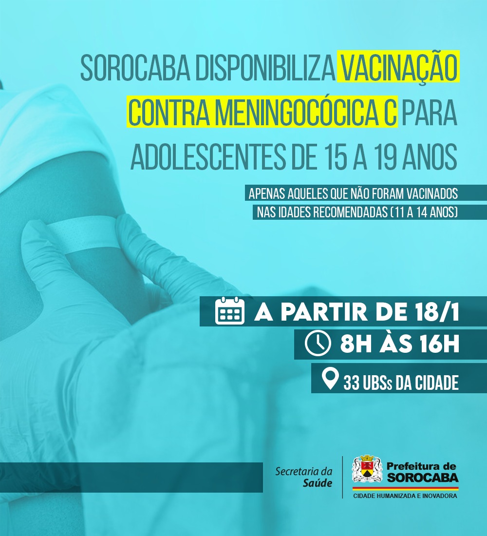 Seguindo determinação do Governo do Estado de São Paulo, Sorocaba disponibilizará, a partir deste quarta-feira (18), nas 33 UBSs da cidade, das 8h às 16h, vacinação extra contra Meningocócica C, para adolescentes de 15 a 19 anos que não foram vacinados nas idades recomendadas (11 a 14 anos).