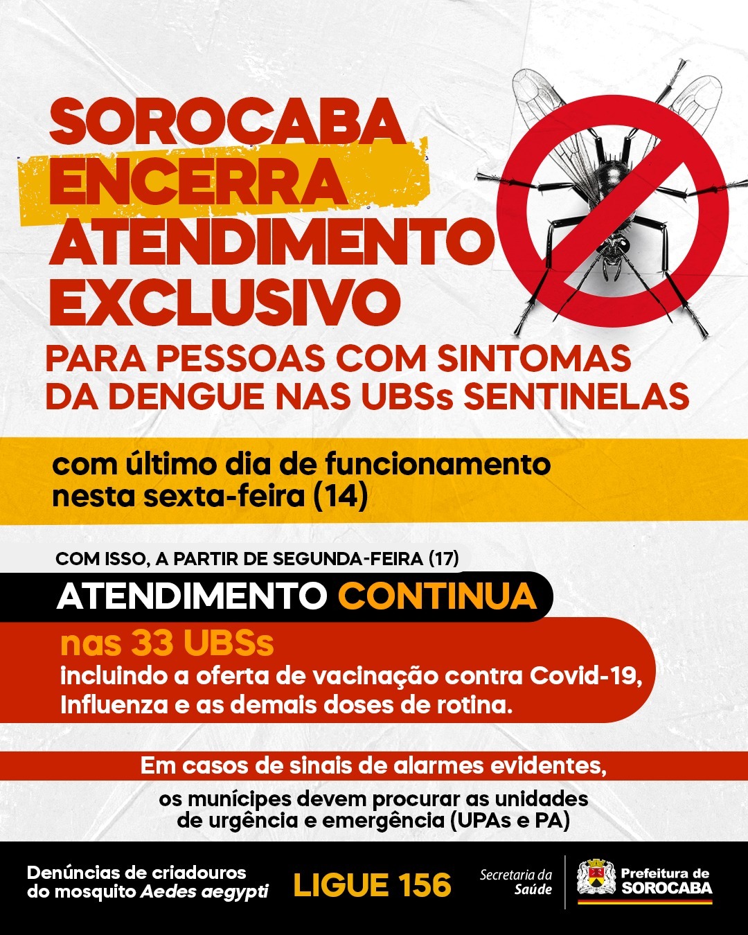 Devido à melhora no cenário epidêmico de dengue e redução da procura médica, a Prefeitura de Sorocaba, por meio da Secretaria da Saúde (SES), encerrará o atendimento exclusivo contra dengue nas Unidades Básicas de Saúde (UBSs) sentinelas (Fiori, Hortência e Simus) com o último dia de funcionamento nesta sexta-feira (14) até 18h.