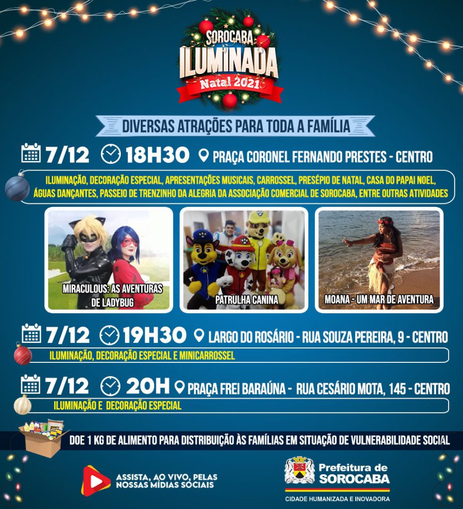 A população vai se encantar com a programação natalina da Praça Coronel Fernando Prestes, que terá, no dia do lançamento, a apresentação de personagens de filmes e desenhos animados infantis, como Moana, Patrulha Canina e Ladybug. O espaço público também contará com Carrossel, Presépio de Natal, Casa do Papai Noel, Águas Dançantes, passeio de Trenzinho da Alegria da Associação Comercial de Sorocaba, entre outras atividades. Para a alegria de toda família, mas principalmente das crianças, o Papai Noel estará presente na praça até o dia 23/12, de segunda a sexta-feira, das 18h às 22h, e aos sábados, das 9h às 13h.