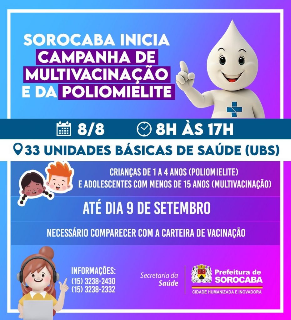 A partir desta segunda-feira (8), a Prefeitura de Sorocaba, por meio da Secretaria da Saúde (SES), inicia a Campanha de Multivacinação e da Poliomielite no município. A aplicação será feita nas 33 Unidades Básicas de Saúde (UBS), das 8h às 17h. A campanha se encerrará no dia 9 de setembro.