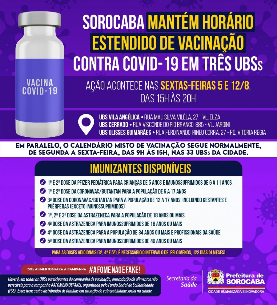 Com o intuito de sempre ampliar a oferta de vacinação aos munícipes, principalmente àqueles que não conseguem se imunizar durante a semana, no período das 9h às 15h, o Município seguirá ofertando a aplicação da vacina contra a Covid-19 em horário estendido no mês de agosto.