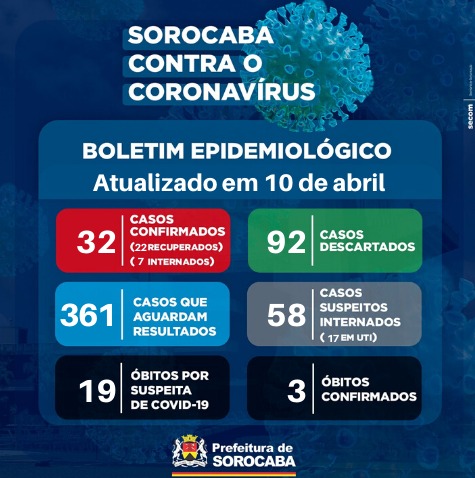 Nesta sexta-feira (10), a Prefeitura de Sorocaba, por meio da Secretaria da Saúde (SES), manteve o número de casos confirmados na cidade em 32. Deste total, sete estão internados (seis em UTI) e 22 já se encontram recuperados. O número de óbitos confirmados com a doença se manteve em três.