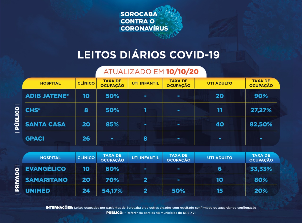 Sorocaba recebeu a notificação de mais 66 novos casos confirmados da Covid-19 neste sábado (10). Do total de confirmados, 51 estão internados (20 em UTI) e o total de pessoas em recuperação (isolamento domiciliar) é 196.