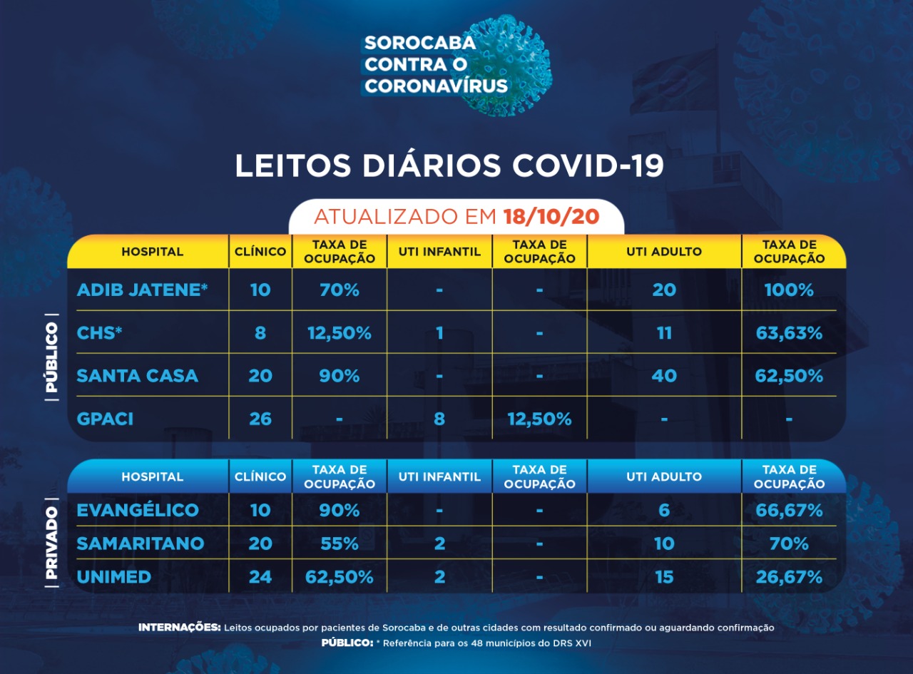 Sorocaba recebeu a notificação de mais 46 novos casos confirmados da Covid-19 neste domingo (18). Do total de confirmados, 48 estão internados (28 em UTI) e o total de pessoas em recuperação (isolamento domiciliar) é 103.