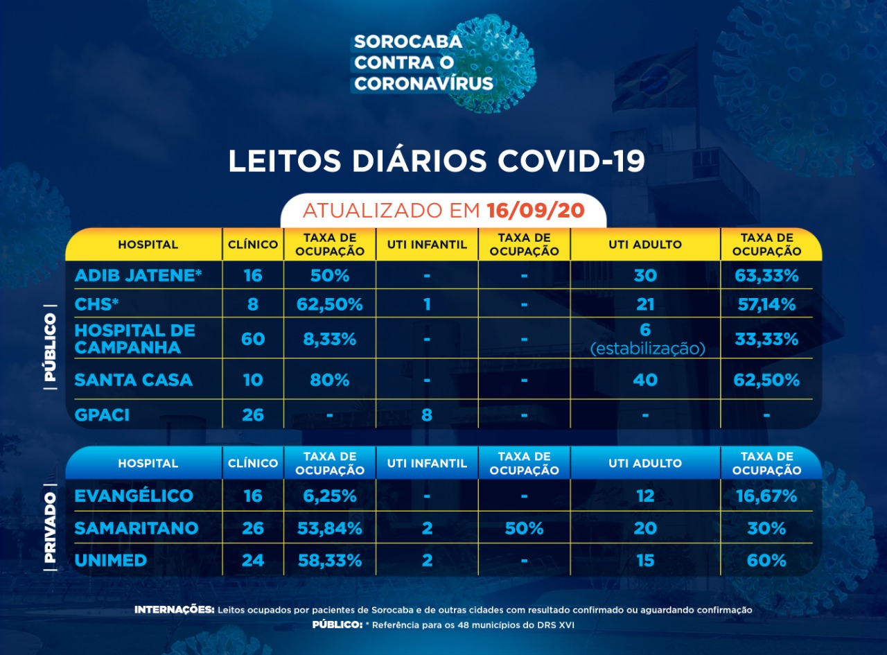Sorocaba recebeu a notificação de mais 79 novos casos confirmados da Covid-19 nesta quarta-feira (16). Do total de confirmados, 45 estão internados (22 em UTI) e o total de pessoas em recuperação (isolamento domiciliar) é 266.