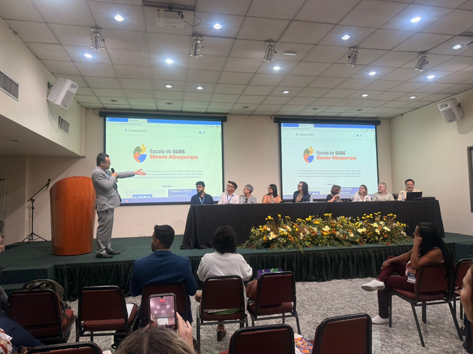 Na sequência, a palestra magna abordou a importância da educação permanente, da gestão do trabalho e da inovação institucional no Suas, com destaque para o lançamento do Portal da Escola Simone Albuquerque e de sua agenda nacional de formação.