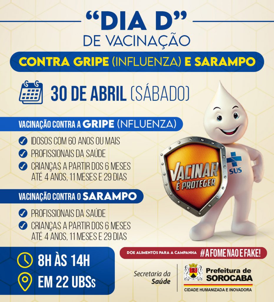 A Prefeitura de Sorocaba, por meio da Secretaria da Saúde (SES), realiza, neste sábado (30), o “Dia D” de vacinação contra gripe (Influenza) e sarampo.