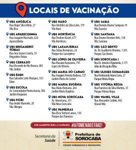 A aplicação das vacinas ocorrerá das 8h às 14h, em 22 Unidades Básicas de Saúde (UBSs) da cidade. São elas: Angélica, Aparecidinha, Brigadeiro Tobias, Cerrado, Éden, Escola, Fiori, Haro, Vila Hortência, Laranjeiras, Lopes de Oliveira, Maria do Carmo, Maria Eugênia, Nova Sorocaba, Paineiras, Sabiá, Vila Santana, São Bento, Sorocaba I, Ulisses Guimarães, Vitoria Régia e Wanel Ville.