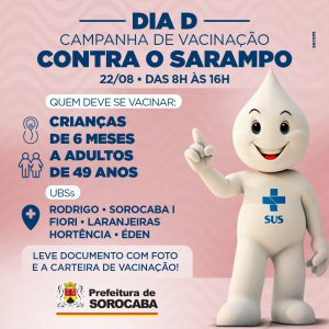 A Prefeitura de Sorocaba, por meio da Secretaria da Saúde (SES), realiza neste sábado (22) o ‘Dia D’ da vacinação contra o sarampo. A aplicação da vacina ocorrerá das 8h às 16h nas Unidades Básicas de Saúde (UBSs) Rodrigo, Sorocaba I, Fiori, Laranjeiras, Hortência e Éden. A realização tem como objetivo intensificar a vacinação em crianças a partir dos 6 meses a adultos de 29 anos, conforme avaliação da situação vacinal. Adultos de 30 a 49 anos também poderão se vacinar.