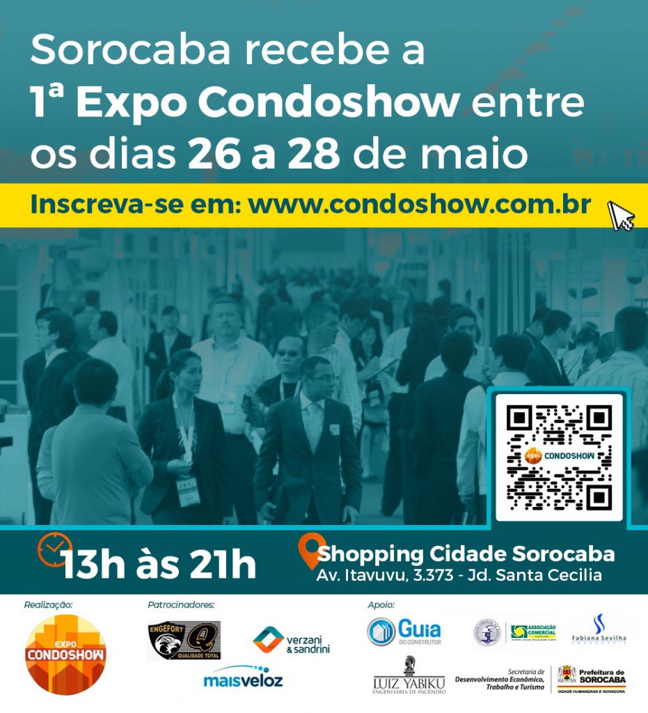 Sorocaba recebe, entre os dias 26 e 28 de maio, no Shopping Cidade Sorocaba, na Zona Norte, a primeira edição da feira Expo Condoshow. As inscrições gratuitas já podem ser realizadas pelo site: https://condoshow.com.br.