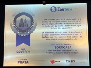 A Prefeitura de Sorocaba recebeu, na noite desta segunda-feira (29), o Selo de Governança de Inovação (Selo Govtech), na categoria prata. O reconhecimento foi promovido pela Plataforma Connected Smart Cities, em parceria com a EXXAS, no intuito de promover boas práticas de governança de ecossistemas de inovação.