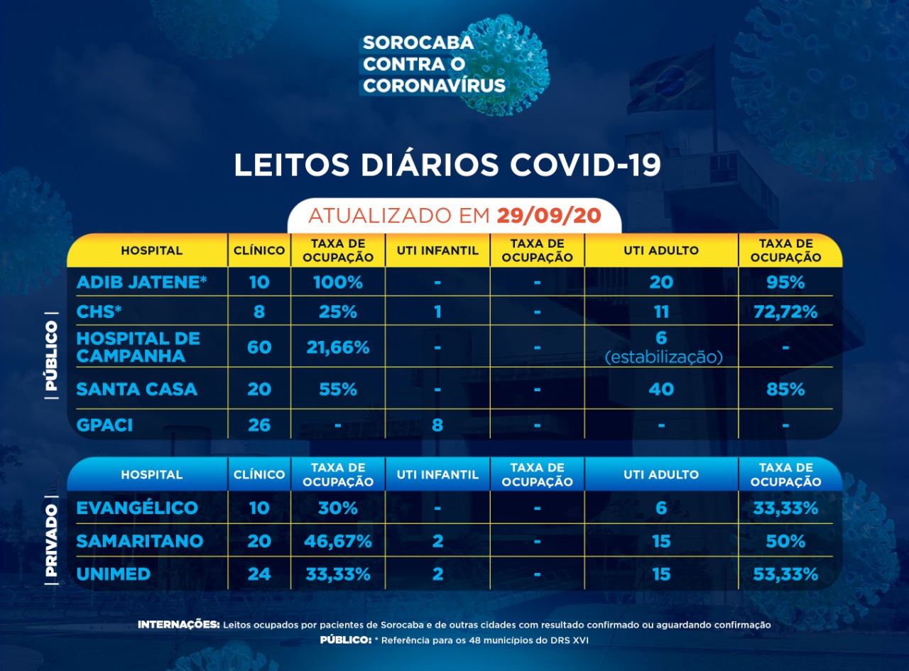 Sorocaba recebeu a notificação de mais 103 novos casos confirmados da Covid-19 nesta terça-feira (29). Do total de confirmados, 45 estão internados (26 em UTI) e o total de pessoas em recuperação (isolamento domiciliar) é 260.
