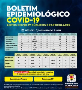 Dos hospitais contratualizados pela Prefeitura de Sorocaba para oferecer leitos Covid, a Santa Casa está com 60% de ocupação nos leitos clínicos Covid. Ou seja, dos 10 existentes, seis possuem pacientes. A ocupação de UTI Covid da Santa Casa é de 50%, o que representa 10 leitos ocupados dos 20 contratados. Dos cinco leitos clínicos Covid do GPACI, quatro estão ocupados. O único leito de UTI infantil Covid está ocupado. O Hospital Amhemed possui 15 leitos clínicos Covid pactuados e quatro estão ocupados. Já, a UTI do mesmo hospital possui dois leitos ocupados do total de quatro. No Hospital Evangélico há oito leitos clínicos e três estão ocupados. Os quatro leitos Covid de UTI encontram-se com 50% de ocupação. Na UPH Zona Leste há 20 leitos clínicos Covid e um está ocupado. O Centro de Estabilização Covid São Guilherme possui 10 leitos clínicos Covid e sete estão ocupados. Já, os 10 leitos de Suporte Ventilatório Pulmonar (LSVP) encontram-se sem ocupação.