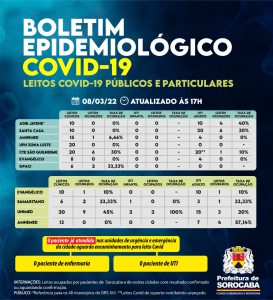Dos hospitais contratualizados pela Prefeitura de Sorocaba para oferecer leitos Covid, a Santa Casa está com 0% de ocupação nos leitos clínicos Covid. Ou seja, dos 10 existentes, nenhum possui paciente. A ocupação de UTI Covid da Santa Casa é de 30%, o que representa seis leitos ocupados dos 20 contratados. Dos seis leitos clínicos Covid do GPACI, dois estão ocupados. O Hospital Amhemed possui 15 leitos clínicos Covid pactuados e um está ocupado. Já, a UTI do mesmo hospital não possui leitos ocupados do total de quatro pactuados. No Hospital Evangélico há oito leitos clínicos e nenhum está ocupado. Dos quatro leitos Covid de UTI, nenhum está ocupado. Na UPH Zona Leste há 20 leitos clínicos Covid e nenhum está ocupado. O Centro de Estabilização Covid São Guilherme possui 20 leitos clínicos Covid e seis estão ocupados. Já, os 20 leitos de Suporte Ventilatório Pulmonar (LSVP) encontram-se com 10% de ocupação.