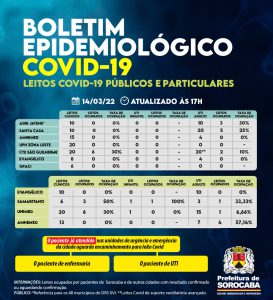 Dos hospitais contratualizados pela Prefeitura de Sorocaba para oferecer leitos Covid, a Santa Casa está com os 10 leitos clínicos Covid desocupados. A ocupação de UTI Covid da Santa Casa é de 25%, o que representa cinco leitos ocupados dos 20 contratados. Dos seis leitos clínicos Covid do GPACI, nenhum está ocupado. O Hospital Amhemed possui 15 leitos clínicos Covid pactuados e não há nenhum ocupado. Entre os quatro leitos de UTI contratados, também nenhum ocupado. No Hospital Evangélico há oito leitos clínicos e nenhum está ocupado. Dos quatro leitos Covid de UTI, nenhum está ocupado. Na UPH Zona Leste há 20 leitos clínicos Covid e nenhum está ocupado. O Centro de Estabilização Covid São Guilherme possui 20 leitos clínicos Covid e seis estão ocupados (30%). Já, os 20 leitos de Suporte Ventilatório Pulmonar (LSVP) encontram-se com 10% de ocupação, ou seja, dois leitos.