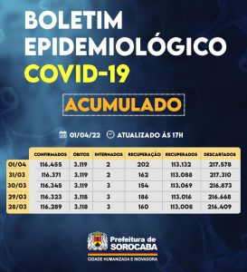 A Prefeitura de Sorocaba, por meio da Secretaria da Saúde (SES), registrou aumento do número de recuperados da Covid-19 nesta sexta-feira (1), chegando ao total de 113.132. Já, os casos confirmados com a doença passaram de 116.371 para 116.455 na cidade. Os óbitos confirmados se mantiveram em 3.119. A taxa de letalidade no município é de 2,6%, abaixo da taxa estadual, que é de 3,2%, e acima da taxa nacional, que se encontra em 2,2%.