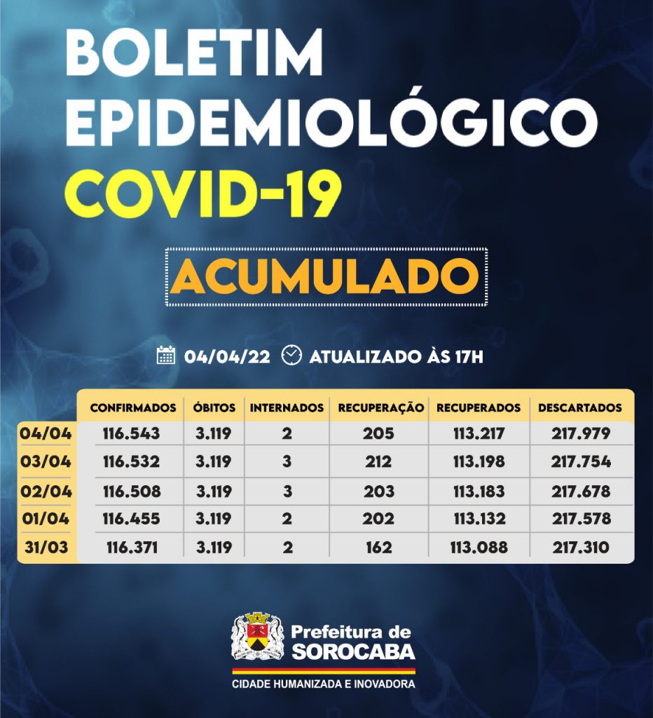 A Prefeitura de Sorocaba, por meio da Secretaria da Saúde (SES), registrou aumento do número de recuperados da Covid-19 nesta segunda-feira (4), chegando ao total de 113.217. Já, os casos confirmados com a doença passaram de 116.532 para 116.543 na cidade. Os óbitos confirmados se mantiveram em 3.119. A taxa de letalidade no município é de 2,6%, abaixo da taxa estadual, que é de 3,2%, e acima da taxa nacional, que se encontra em 2,2%.
