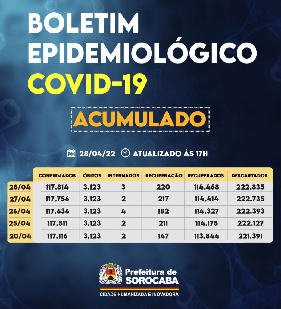 A Prefeitura de Sorocaba, por meio da Secretaria da Saúde (SES), registrou aumento do número de recuperados da Covid-19 nesta quinta-feira (28), chegando ao total de 114.468. Já, os casos confirmados com a doença passaram de 117.756 para 117.814 na cidade. Os óbitos confirmados permaneceram em 3.123. A taxa de letalidade no município é de 2,6%, abaixo da taxa estadual, que é de 3,2%, e acima da taxa nacional, que se encontra em 2,2%.