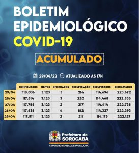 A Prefeitura de Sorocaba, por meio da Secretaria da Saúde (SES), registrou aumento do número de recuperados da Covid-19 nesta sexta-feira (29), chegando ao total de 114.696. Já, os casos confirmados com a doença passaram de 117.814 para 118.036 na cidade. Os óbitos confirmados permaneceram em 3.123. A taxa de letalidade no município é de 2,6%, abaixo da taxa estadual, que é de 3,2%, e acima da taxa nacional, que se encontra em 2,2%.