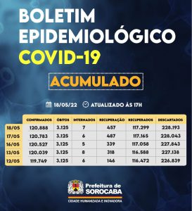 A Prefeitura de Sorocaba, por meio da Secretaria da Saúde (SES), registrou aumento do número de recuperados da Covid-19 nesta quarta-feira (18), chegando ao total de 117.299. Já, os casos confirmados com a doença passaram de 120.783 para 120.888 na cidade. Os óbitos confirmados se mantiveram em 3.125. A taxa de letalidade no município é de 2,6%, abaixo da taxa estadual, que é de 3,2%, e acima da taxa nacional, que se encontra em 2,2%.