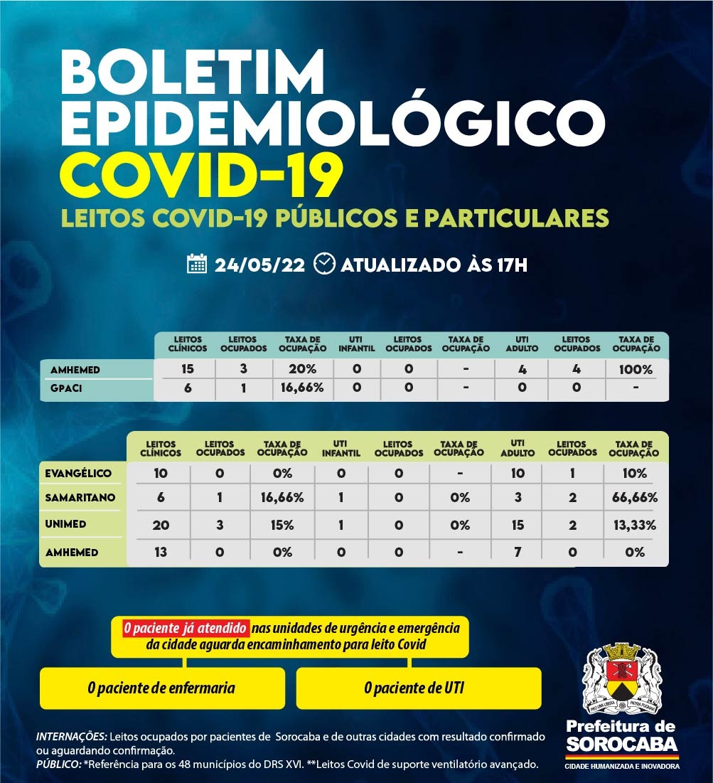 No censo diário de leitos da Covid-19 desta terça-feira (24), dos hospitais contratualizados pela Prefeitura de Sorocaba para oferecer leitos Covid, o GPACI possui uma ocupação nos seis leitos clínicos. O Hospital Amhemed possui 15 leitos clínicos Covid pactuados e três estão com ocupação. Entre os quatro leitos de UTI contratados, quatro estão ocupados.