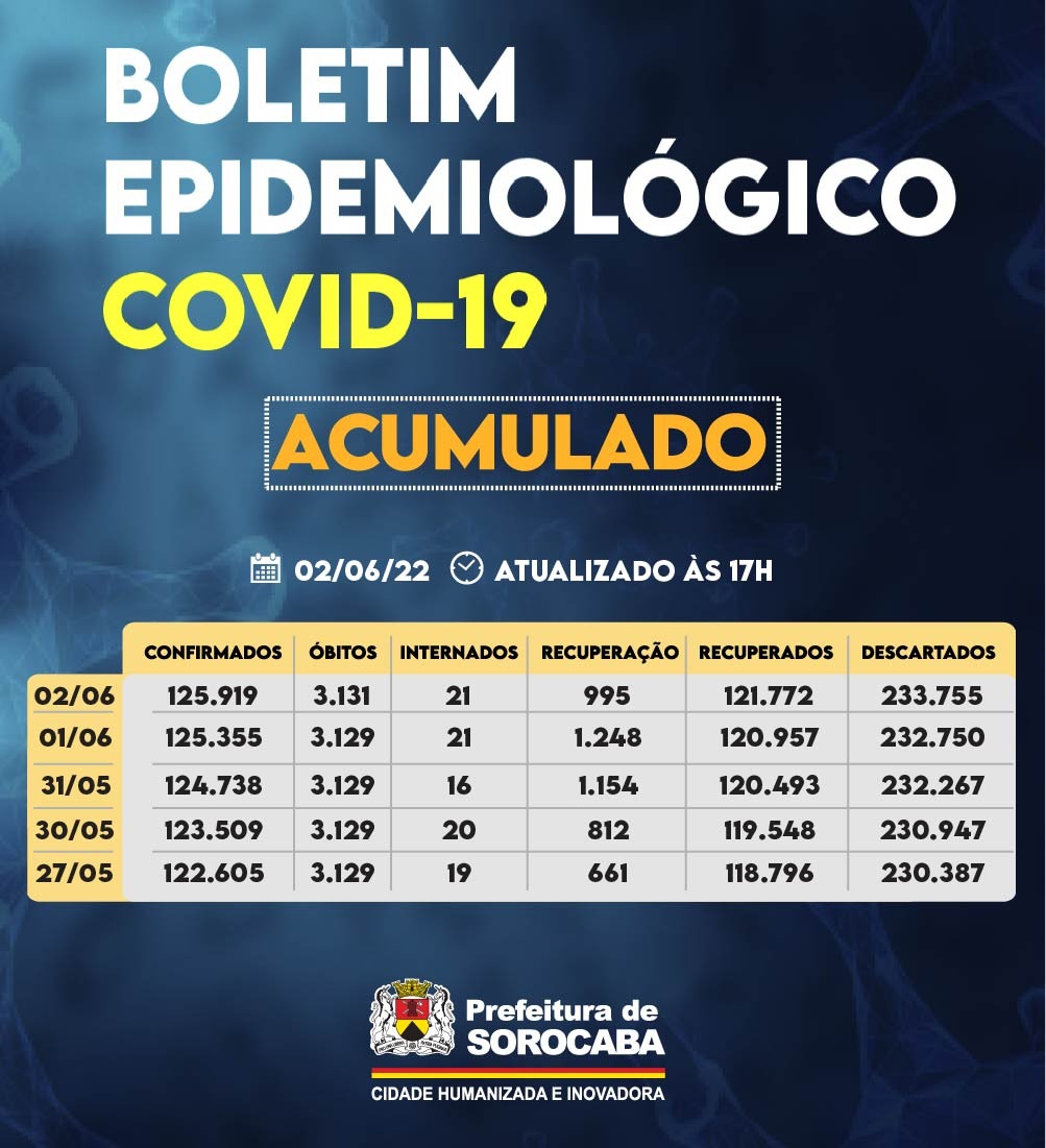 A Prefeitura de Sorocaba, por meio da Secretaria da Saúde (SES), registrou aumento do número de recuperados da Covid-19 nesta quinta-feira (2), chegando ao total de 121.772. Já, os casos confirmados com a doença passaram de 125.355 para 125.919 na cidade.