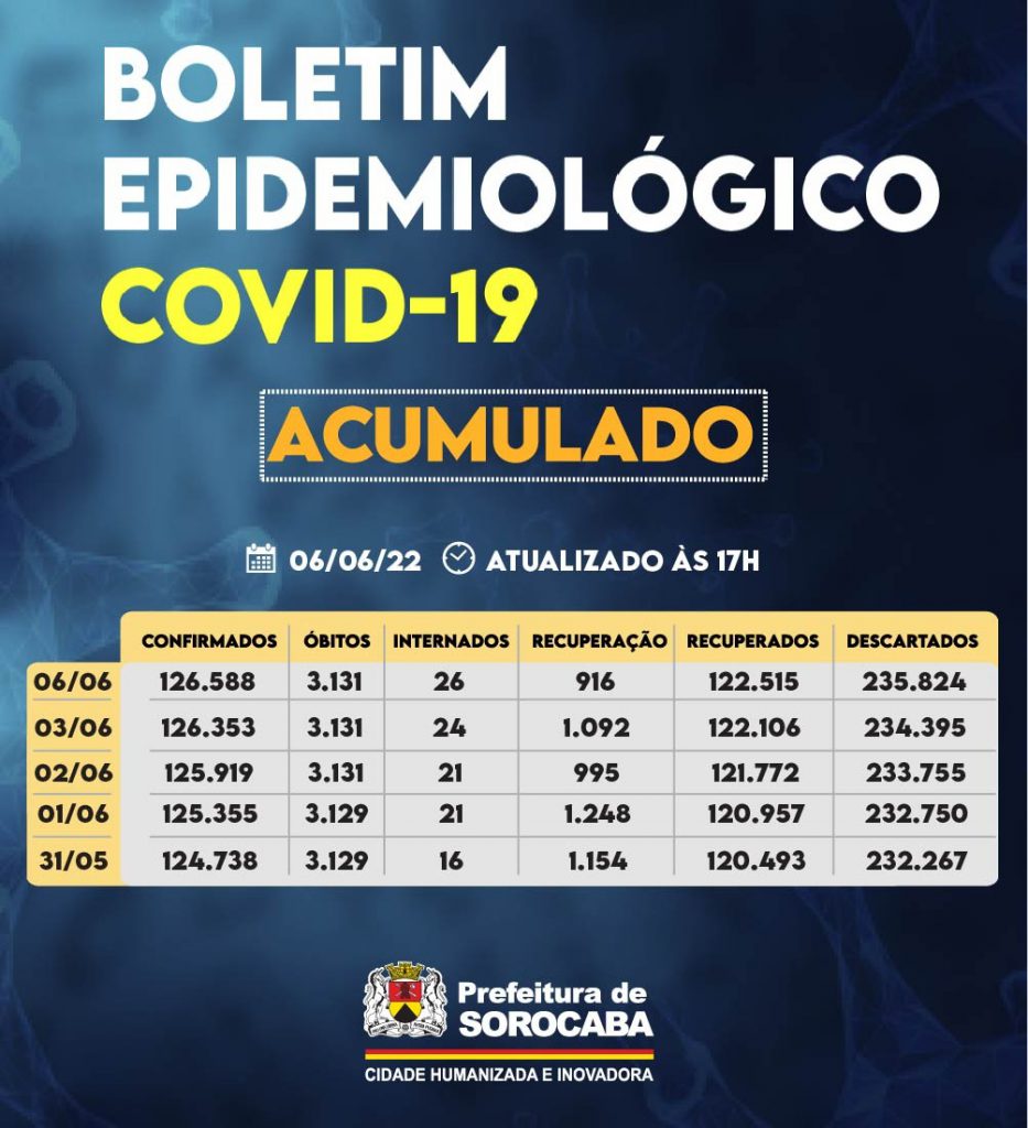 A Prefeitura de Sorocaba, por meio da Secretaria da Saúde (SES), registrou aumento do número de recuperados da Covid-19 nesta segunda-feira (6), chegando ao total de 122.515. Já, os casos confirmados com a doença passaram de 126.353 para 126.588 na cidade. Os óbitos confirmados se mantiveram em 3.131. A taxa de letalidade no município é de 2,5%, abaixo da taxa estadual, que é de 3,1%, e acima da taxa nacional, que se encontra em 2,2%.